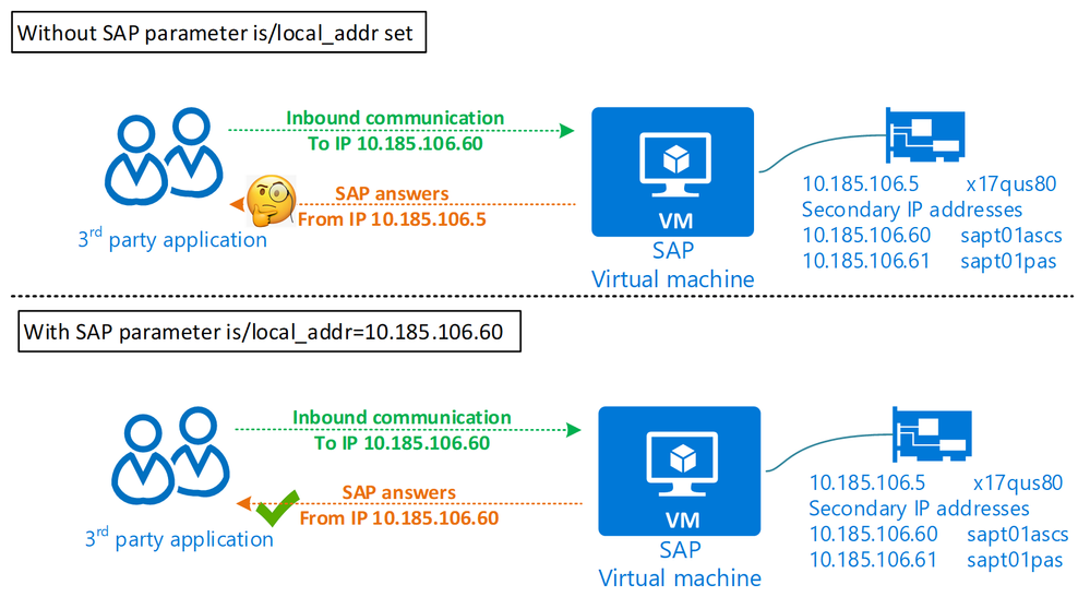 However, we often don’t think of egress traffic, how our SAP systems looks to the other application. By default, SAP answers back with the primary IP of the network interface. For some applications which do a reverse lookup (IP -> hostname) this might be a security issue. From its perspective it tries to talk with John (the SAP virtual hostname) but the response (IP traffic back) comes from an address where Peter (VM hostname) is registered at.