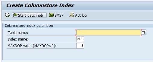 After applying https://launchpad.support.sap.com/ , you can create one NCCI per table using SAP report MSS_CS_CREATE. This Columnstore Index always contains all fields of the table (with a few exceptions, e.g. IMAGE fields). Report MSS_CS_CREATE only has three parameters: Table name, index name and degree of parallelism, which defines the number of logical CPUs used for the index creation.