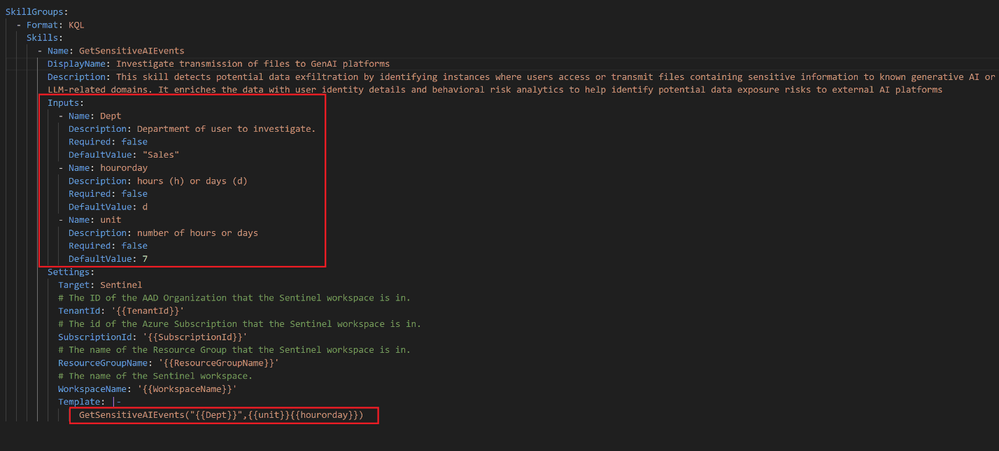 Security Copilot plugins often accept user input (e.g., usernames, time ranges, IPs). Parameterized functions allow these inputs to be consistently injected into KQL queries without rebuilding query logic. - Plugin reusability: