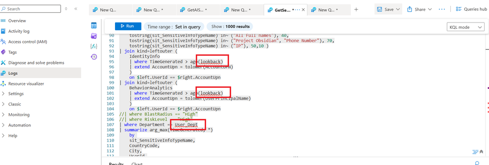 Fig. 3. Function menu showing the two parameters defined in the function creation menu of Log Analytics3. Test the query. Note the order of parameter definition in the UI. i.e. first the User_Dept THEN the lookback period. You can interchange them if you like but this will determine how you submit the query using the function. If the User_Dept parameter was defined first then it needs to come first when executing the function. See the below screenshot. Switching them will result in the wrong parameter being passed to the query and consequently 0 results will be returned.