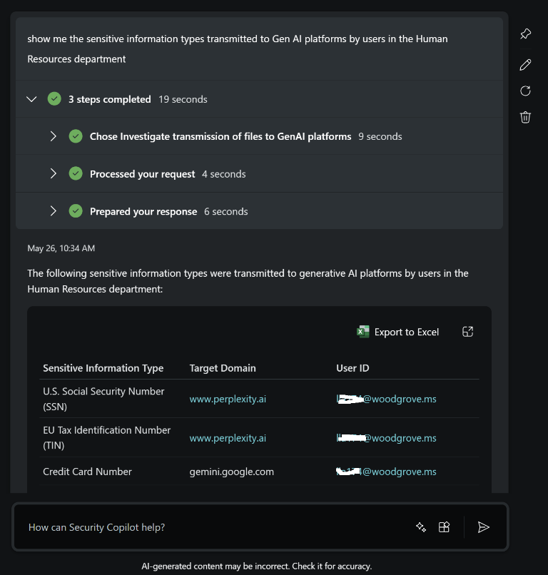 Fig. 9: View of Secuity Copilot landing page showing an example of direct skill execution of the created pluginFig. 10: Sample output showing records of users from the Sales departmentNext, we still use direct skill invocation, but this time specify our own parameters: