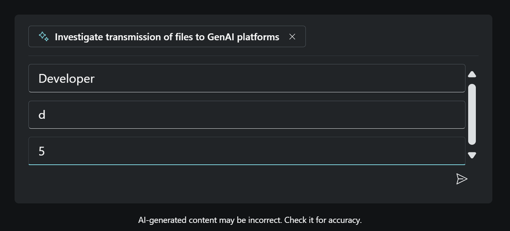 CloudAppEvents | where RawEventData.TargetDomain has_any ( 'grok.com', 'x.ai', 'mistral.ai', 'cohere.ai', 'perplexity.ai', 'huggingface.co', 'adventureai.gg', 'ai.google/discover/palm2', 'ai.meta.com/llama', 'ai2006.io', 'aibuddy.chat', 'aidungeon.io', 'aigcdeep.com', 'ai-ghostwriter.com', 'aiisajoke.com', 'ailessonplan.com', 'aipoemgenerator.org', 'aissistify.com', 'ai-writer.com', 'aiwritingpal.com', 'akeeva.co', 'aleph-alpha.com/luminous', 'alphacode.deepmind.com', 'analogenie.com', 'anthropic.com/index/claude-2', 'anthropic.com/index/introducing-claude', 'anyword.com', 'app.getmerlin.in', 'app.inferkit.com', 'app.longshot.ai', 'app.neuro-flash.com', 'applaime.com', 'articlefiesta.com', 'articleforge.com', 'askbrian.ai', 'aws.amazon.com/bedrock/titan', 'azure.microsoft.com/en-us/products/ai-services/openai-service', 'bard.google.com', 'beacons.ai/linea_builds', 'bearly.ai', 'beatoven.ai', 'beautiful.ai', 'beewriter.com', 'bettersynonyms.com', 'blenderbot.ai', 'bomml.ai', 'bots.miku.gg', 'browsegpt.ai', 'bulkgpt.ai', 'buster.ai', 'censusgpt.com', 'chai-research.com', 'character.ai', 'charley.ai', 'charshift.com', 'chat.lmsys.org', 'chat.mymap.ai', 'chatbase.co', 'chatbotgen.com', 'chatgpt.com', 'chatgptdemo.net', 'chatgptduo.com', 'chatgptspanish.org', 'chatpdf.com', 'chattab.app', 'claid.ai', 'claralabs.com', 'claude.ai/login', 'clipdrop.co/stable-diffusion', 'cmdj.app', 'codesnippets.ai', 'cohere.com', 'cohesive.so', 'compose.ai', 'contentbot.ai', 'contentvillain.com', 'copy.ai', 'copymatic.ai', 'copymonkey.ai', 'copysmith.ai', 'copyter.com', 'coursebox.ai', 'coverler.com', 'craftly.ai', 'crammer.app', 'creaitor.ai', 'dante-ai.com', 'databricks.com', 'deepai.org', 'deep-image.ai', 'deepreview.eu', 'descrii.tech', 'designs.ai', 'docgpt.ai', 'dreamily.ai', 'editgpt.app', 'edwardbot.com', 'eilla.ai', 'elai.io', 'elephas.app', 'eleuther.ai', 'essayailab.com', 'essay-builder.ai', 'essaygrader.ai', 'essaypal.ai', 'falconllm.tii.ae', 'finechat.ai', 'finito.ai', 'fireflies.ai', 'firefly.adobe.com', 'firetexts.co', 'flowgpt.com', 'flowrite.com', 'forethought.ai', 'formwise.ai', 'frase.io', 'freedomgpt.com', 'gajix.com', 'gemini.google.com', 'genei.io', 'generatorxyz.com', 'getchunky.io', 'getgptapi.com', 'getliner.com', 'getsmartgpt.com', 'getvoila.ai', 'gista.co', 'github.com/features/copilot', 'giti.ai', 'gizzmo.ai', 'glasp.co', 'gliglish.com', 'godinabox.co', 'gozen.io', 'gpt.h2o.ai', 'gpt3demo.com', 'gpt4all.io', 'gpt-4chan+)', 'gpt6.ai', 'gptassistant.app', 'gptfy.co', 'gptgame.app', 'gptgo.ai', 'gptkit.ai', 'gpt-persona.com', 'gpt-ppt.neftup.app', 'gptzero.me', 'grammarly.com', 'hal9.com', 'headlime.com', 'heimdallapp.org', 'helperai.info', 'heygen.com', 'heygpt.chat', 'hippocraticai.com', 'huggingface.co/spaces/tiiuae/falcon-180b-demo', 'humanpal.io', 'hypotenuse.ai', 'ichatwithgpt.com', 'ideasai.com', 'ingestai.io', 'inkforall.com', 'inputai.com/chat/gpt-4', 'instantanswers.xyz', 'instatext.io', 'iris.ai', 'jasper.ai', 'jigso.io', 'kafkai.com', 'kibo.vercel.app', 'kloud.chat', 'koala.sh', 'krater.ai', 'lamini.ai', 'langchain.com', 'laragpt.com', 'learn.xyz', 'learnitive.com', 'learnt.ai', 'letsenhance.io', 'letsrevive.app', 'lexalytics.com', 'lgresearch.ai', 'linke.ai', 'localbot.ai', 'luis.ai', 'lumen5.com', 'machinetranslation.com', 'magicstudio.com', 'magisto.com', 'mailshake.com/ai-email-writer', 'markcopy.ai', 'meetmaya.world', 'merlin.foyer.work', 'mieux.ai', 'mightygpt.com', 'mosaicml.com', 'murf.ai', 'myaiteam.com', 'mygptwizard.com', 'narakeet.com', 'nat.dev', 'nbox.ai', 'netus.ai', 'neural.love', 'neuraltext.com', 'newswriter.ai', 'nextbrain.ai', 'noluai.com', 'notion.so', 'novelai.net', 'numind.ai', 'ocoya.com', 'ollama.ai', 'openai.com', 'ora.ai', 'otterwriter.com', 'outwrite.com', 'pagelines.com', 'parallelgpt.ai', 'peppercontent.io', 'perplexity.ai', 'personal.ai', 'phind.com', 'phrasee.co', 'play.ht', 'poe.com', 'predis.ai', 'premai.io', 'preppally.com', 'presentationgpt.com', 'privatellm.app', 'projectdecember.net', 'promptclub.ai', 'promptfolder.com', 'promptitude.io', 'qopywriter.ai', 'quickchat.ai/emerson', 'quillbot.com', 'rawshorts.com', 'read.ai', 'rebecc.ai', 'refraction.dev', 'regem.in/ai-writer', 'regie.ai', 'regisai.com', 'relevanceai.com', 'replika.com', 'replit.com', 'resemble.ai', 'resumerevival.xyz', 'riku.ai', 'rizzai.com', 'roamaround.app', 'rovioai.com', 'rytr.me', 'saga.so', 'sapling.ai', 'scribbyo.com', 'seowriting.ai', 'shakespearetoolbar.com', 'shortlyai.com', 'simpleshow.com', 'sitegpt.ai', 'smartwriter.ai', 'sonantic.io', 'soofy.io', 'soundful.com', 'speechify.com', 'splice.com', 'stability.ai', 'stableaudio.com', 'starryai.com', 'stealthgpt.ai', 'steve.ai', 'stork.ai', 'storyd.ai', 'storyscapeai.app', 'storytailor.ai', 'streamlit.io/generative-ai', 'summari.com', 'synesthesia.io', 'tabnine.com', 'talkai.info', 'talkpal.ai', 'talktowalle.com', 'team-gpt.com', 'tethered.dev', 'texta.ai', 'textcortex.com', 'textsynth.com', 'thirdai.com/pocketllm', 'threadcreator.com', 'thundercontent.com', 'tldrthis.com', 'tome.app', 'toolsaday.com/writing/text-genie', 'to-teach.ai', 'tutorai.me', 'tweetyai.com', 'twoslash.ai', 'typeright.com', 'typli.ai', 'uminal.com', 'unbounce.com/product/smart-copy', 'uniglobalcareers.com/cv-generator', 'usechat.ai', 'usemano.com', 'videomuse.app', 'vidext.app', 'virtualghostwriter.com', 'voicemod.net', 'warmer.ai', 'webllm.mlc.ai', 'wellsaidlabs.com', 'wepik.com', 'we-spots.com', 'wordplay.ai', 'wordtune.com', 'workflos.ai', 'woxo.tech', 'wpaibot.com', 'writecream.com', 'writefull.com', 'writegpt.ai', 'writeholo.com', 'writeme.ai', 'writer.com', 'writersbrew.app', 'writerx.co', 'writesonic.com', 'writesparkle.ai', 'writier.io', 'yarnit.app', 'zevbot.com', 'zomani.ai' ) | extend sit = parse_json(tostring(RawEventData.SensitiveInfoTypeData)) | mv-expand sit | summarize Event_Count = count() by tostring(sit.SensitiveInfoTypeName), CountryCode, City, UserId = tostring(RawEventData.UserId), TargetDomain = tostring(RawEventData.Targ