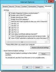 - Go back into IE and disable the option to Use TLS 1.2 only