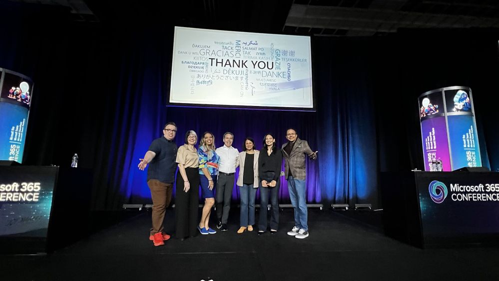 The Intrazone guest: Jeff Teper – President of Collaborative Apps and Platforms, Microsoft – among his peers after delivering the Microsoft 365 Conference opening keynote; left-to-right: Jason Moore, Denise Trabona, Karuana Gatimu, Jeff Teper, Sumi Singh, Sumit Chauhan, and Sesha Mani.