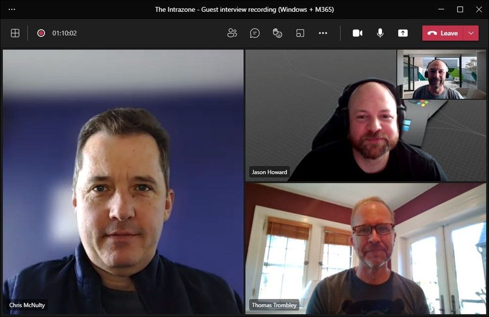 Intrazone hosts + guests: Chris McNulty (Director – Microsoft Viva Topics and SharePoint Syntex) [co-host], Jason Howard (Senior program manager - Windows, Developers, and Experiences (WDX)), {smaller inlay photo upper-right} Mark Kashman (Senior product manager – Microsoft Lists and SharePoint) [co-host], and Thomas Trombley (Senior program manager - Windows Servicing and Delivery).