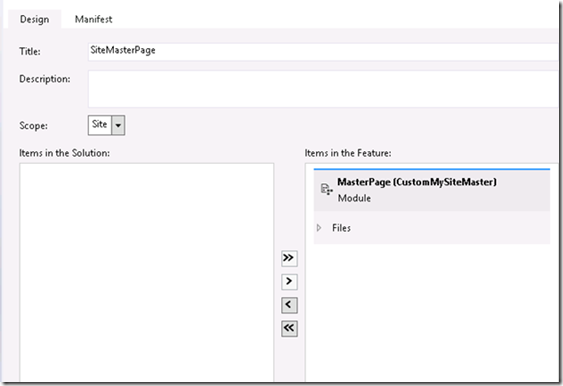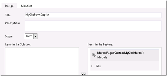 Create another farm level feature. Name it as MySiteFarmStapler. Add a new empty element to the project and name it as ML_ApplyCustomMasterPageStapler. Add the following markup to the XML.
