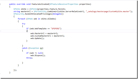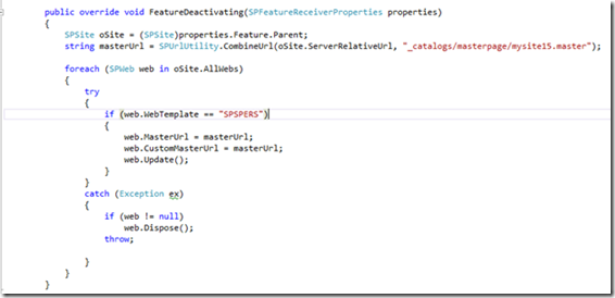 Save all the files and deploy. Login to your personal site and activate the feature from Site collection features. Personal sites created henceforth will have the new master page applied to it.