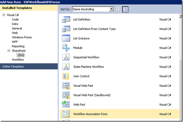 4. Select ‘SharePoint’ > ‘2010’ from Installed Templates and scroll down to select ‘Workflow Association Form’.