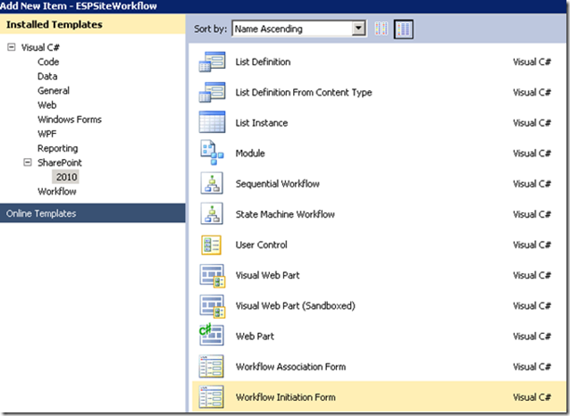 23. Select ‘SharePoint’ > ‘2010’ from Installed Templates and scroll down to select ‘Workflow Initiation Form’.