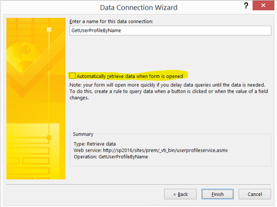 Make sure that GetUserProfileByName data connection has below option unchecked,