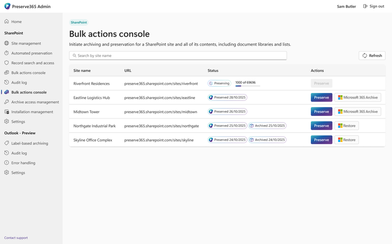 Preserve365 admin center for archiving and actively preserving SharePoint sites“We are pleased to expand our collaboration with Microsoft to bring Active Digital Preservation to Microsoft 365 Archive customers. Using Preserve365®, IT and IG teams can now seamlessly archive and actively preserve high-value SharePoint sites to ensure critical long-term files are instantly viewable in trusted, readable formats for compliance, legal and AI-driven initiatives.” – Stuart Reed, Chief Product Officer, Preservica