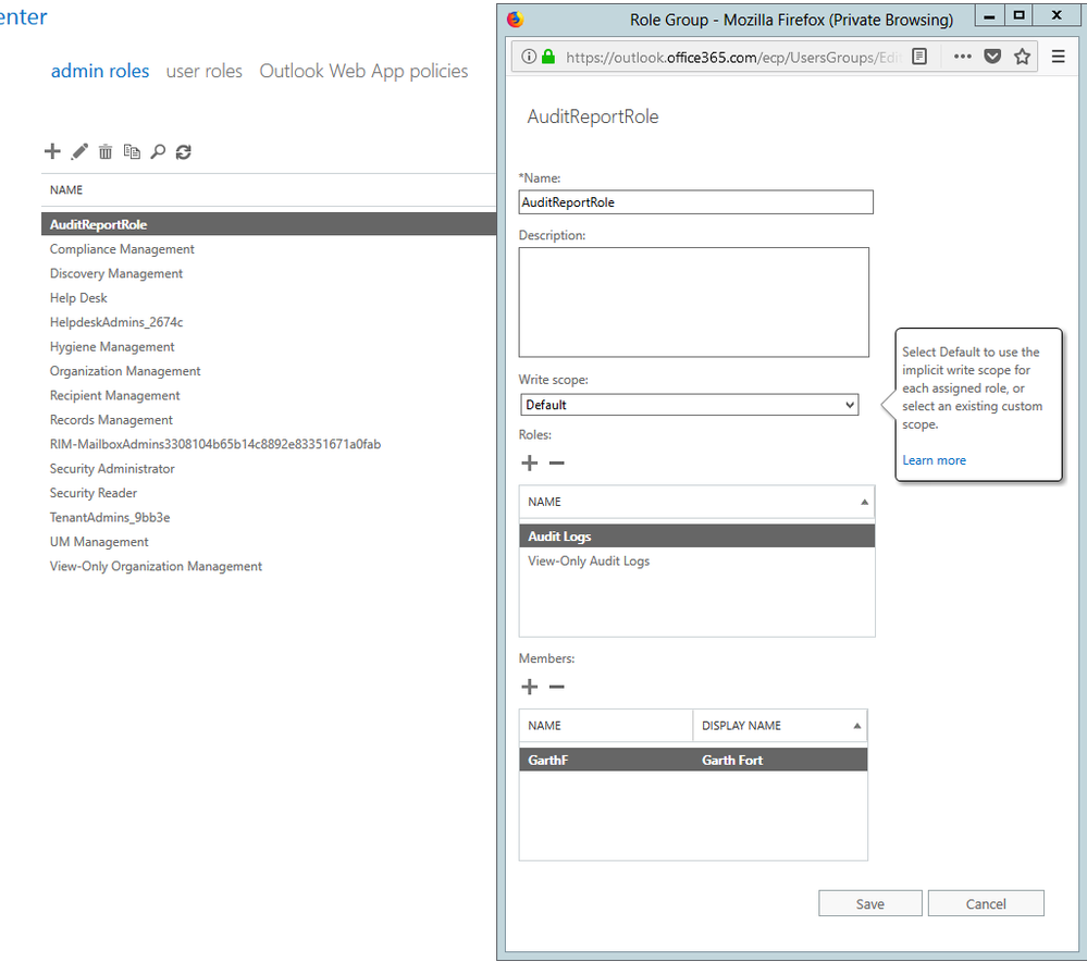 In the screenshot below. I am creating a new admin role called “AuditReportRole”, assigning minimum required permissions “Audit Logs” and “View-Only Audit Logs” and granting a user “Garth Fort” permission to be able to access the Usage reports.