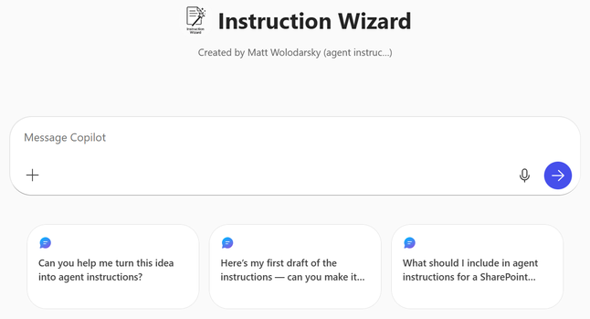 Employees need practical support to develop this new skill. You can deploy the Instruction Wizard Agent in your tenant – a meta-agent designed to help users craft clear, high-quality instructions for their own SharePoint agents.