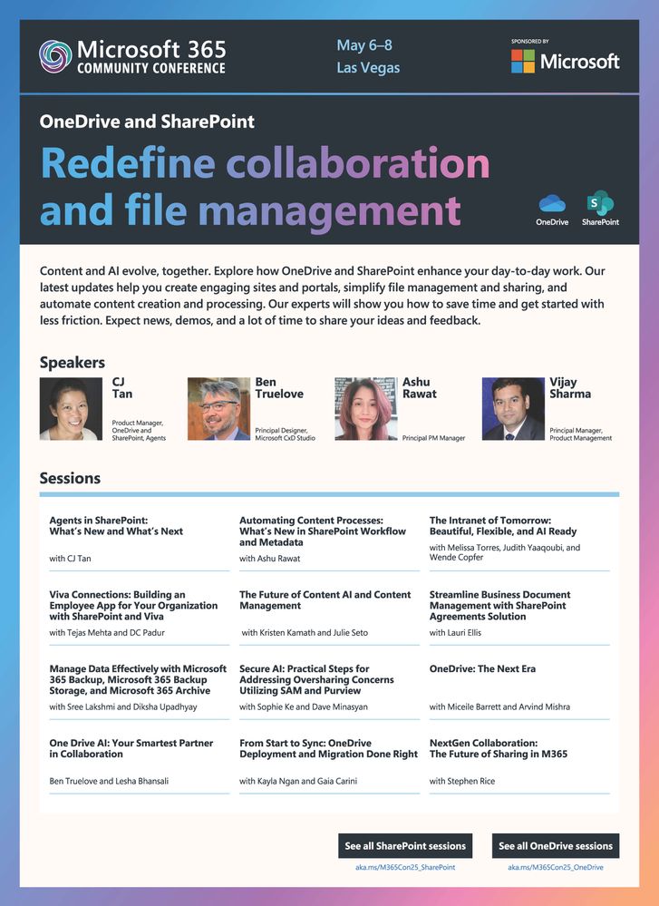 Overview of OneDrive and SharePoint presenters and content planned for the Microsoft 365 Community Conference | Las Vegas, NV | May 6-8, 2025.