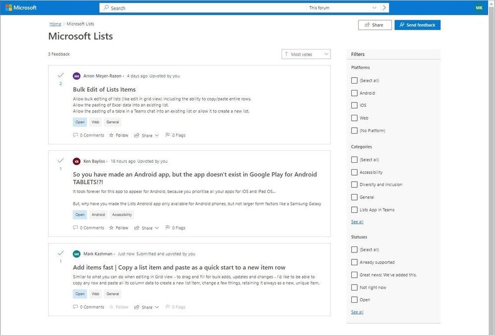 Community feedback is public and allows you to browse or vote. Your username will be displayed when you Send feedback. You can Search for, upvote (simply click on the Vote count number/item), Comment on, and Share feedback that matches yours. I added a new idea today; it’s fast, easy, and checked regularly by the Lists product team to comment and add status.