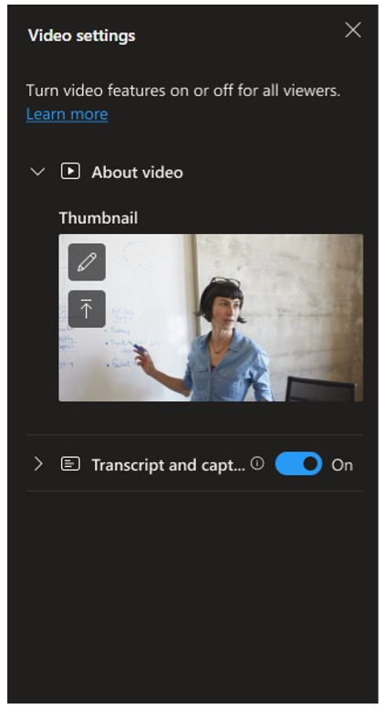 - Custom thumbnail, located in Video Settings, will allow users with edit permissions to change the default thumbnail by uploading an image or selecting a frame from the video. This custom thumbnail will be used throughout Microsoft 365.
