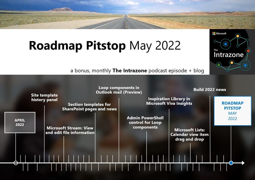 May 2022 brought a lot of new tech to Microsoft 365 - lots of SharePoint and related tech goodness: Site template history panel, Microsoft Stream: View and edit file information, Section templates for SharePoint pages and news, Loop components in Outlook mail (Preview), Admin PowerShell control for Loop components, Inspiration Library in Microsoft Viva Insights, Microsoft Lists: Calendar view item drag and drop, Build 2022 news, and more; all listed below with screenshots and links to more details.