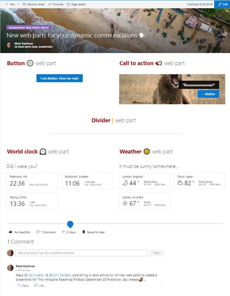 A SharePoint team site news article showcasing five of the new web parts: Button, Call to action, Divider, World clock and Weather.