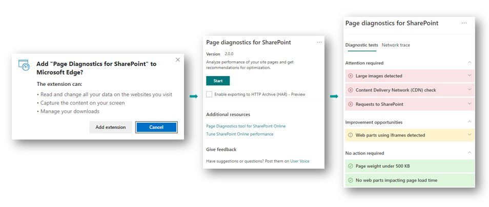 Left-to-right: 1) Add the "Page Diagnostics for SharePoint” browser extension, 2) Click on the extension's toolbar button to load the tool, and 3) Read the analysis results.