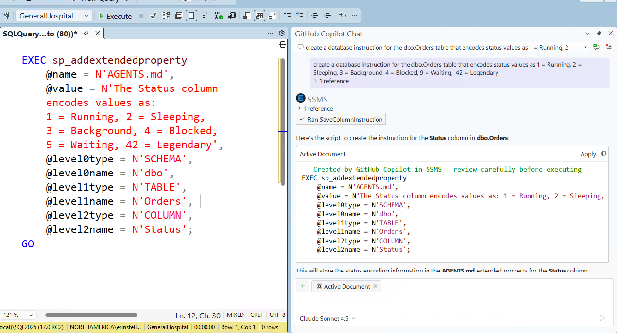 The database instructions feature allows you to add database-specific context that describe business rules and leverages extended properties. By storing this information in the database, it’s available to anyone who uses GitHub Copilot when connected to that database. The instructions follow the AGENTS.md format to provide context. Once in place, you no longer need to ask the person who’s supported the application for 20 years what the values 9 and 42 mean for the Status column in the Orders table.