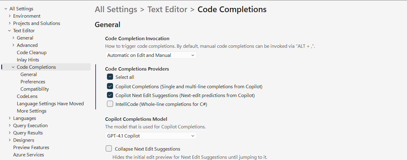 Code completions for GitHub Copilot in SSMS are not the same as IntelliSense, and I’d argue they exceed the concept of “IntelliSense on steroids”. The more T-SQL that exists in the editor window, the more powerful you’ll find the suggestions to be. If you find that completions and IntelliSense are competing, you may want to try turning off IntelliSense. I’m extremely pleased with the code completion capabilities, and I’m excited for you all to give it a try.
