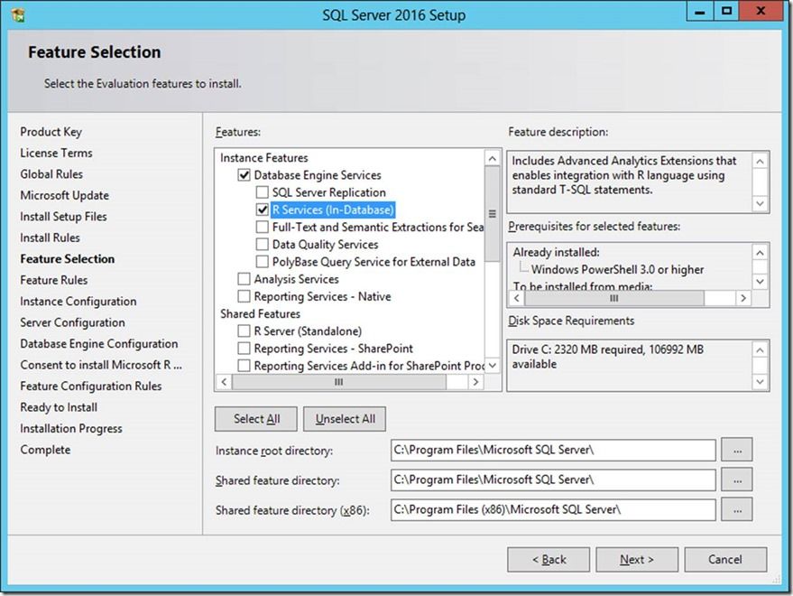 Let’s begin with the easiest ‘offline setup’ scenario for SQL Server R Services. In this scenario, setup is launched by double-clicking setup.exe from the SQL Server 2016 installation media. After accepting the license agreement, selecting the edition etc. you are prompted for the features to install. We will select just the SQL engine and R Services (in-database) for simplicity: