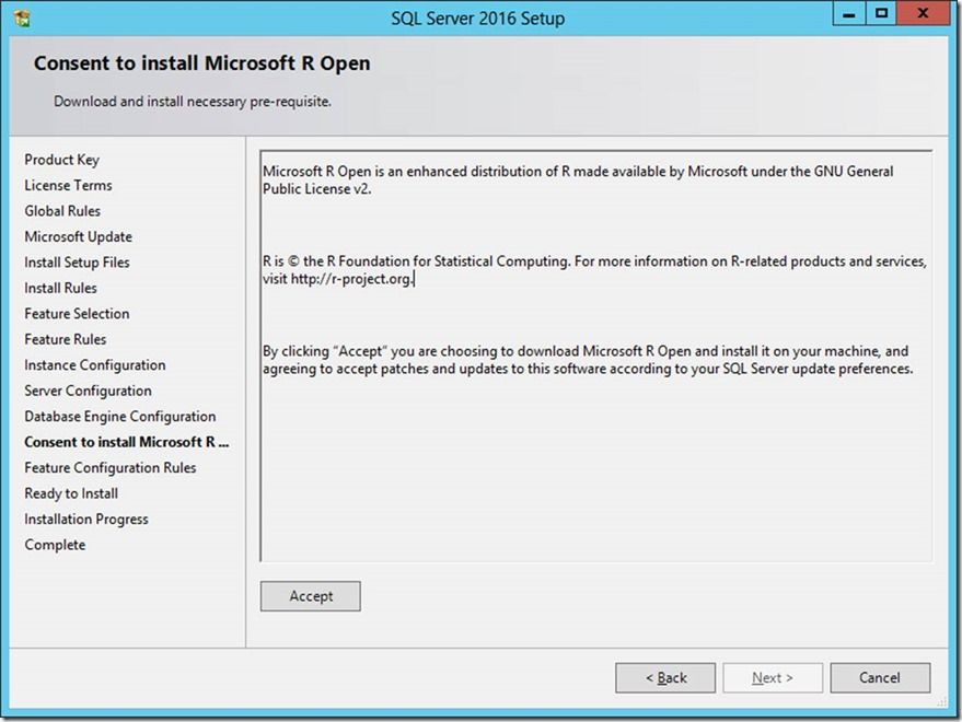 - IACCEPTROPENLICENSETERMS – this switch is the equivalent of pressing the ‘Accept’ button in the GUI when prompted to accept the R Open licensing terms. Note that this is in addition to the IACCEPTSQLSERVERLICENSETERMS required for any unattended SQL Server setup.