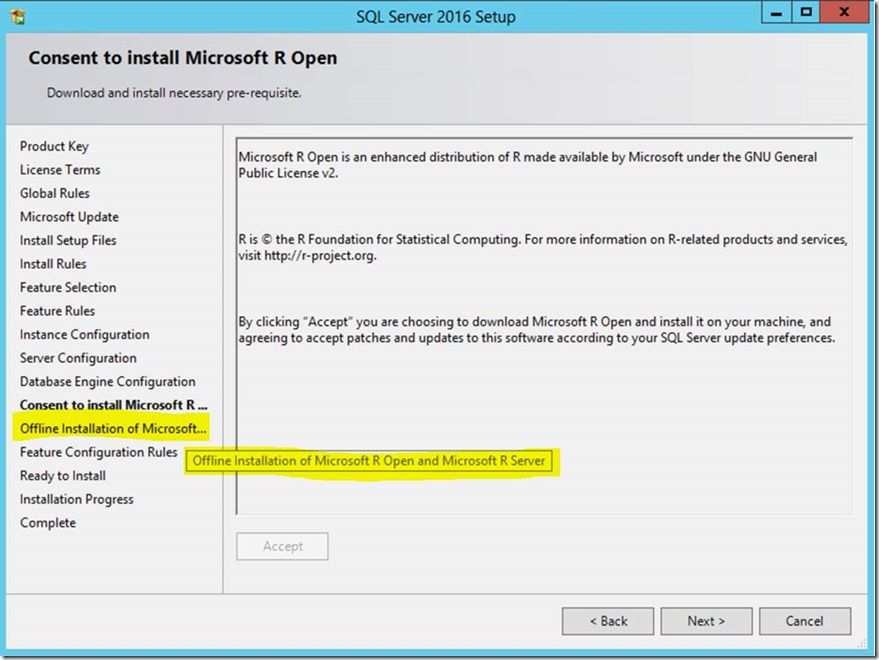 After accepting the license agreement for R components, if the computer were able to access the Internet, it would automatically download the requisite R components and proceed. But given that we are in an ‘offline’ scenario, setup needs additional information to proceed. This is apparent when you look at the list of steps on the left of the wizard, a new step ‘Offline installation of Microsoft R Open and Microsoft R Server’ has appeared: