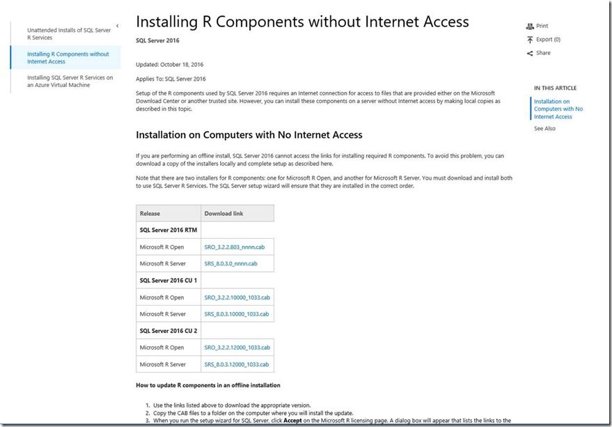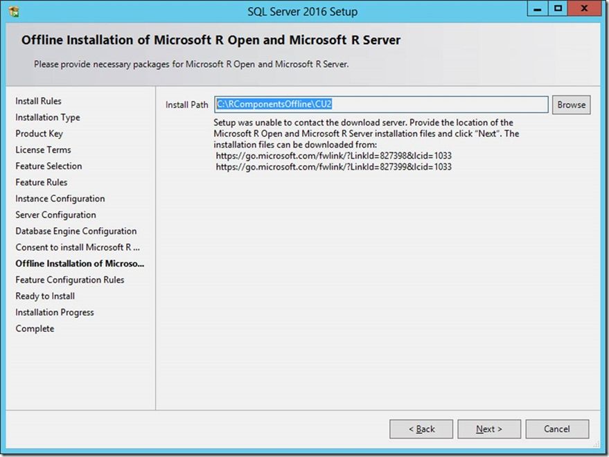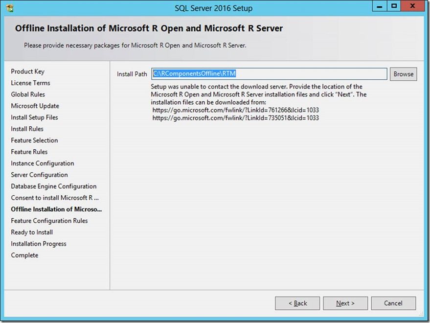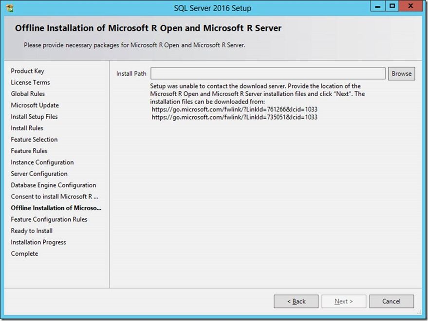 This new screen (figure 5 below) is where you are prompted to direct setup to the requisite copies of the R components. In one-off scenarios, you can look at the links on the screen, and download those files on a computer which has Internet access; then move the 2 files back to the computer where SQL setup is running (this is the computer which does not have Internet access). But to be proactive you can download these CAB files ahead of time based on the Installing R Components without Internet Access page. That webpage (figure 4) lists the URLs to the CAB files containing the correct version of the R components for each version of SQL Server 2016: