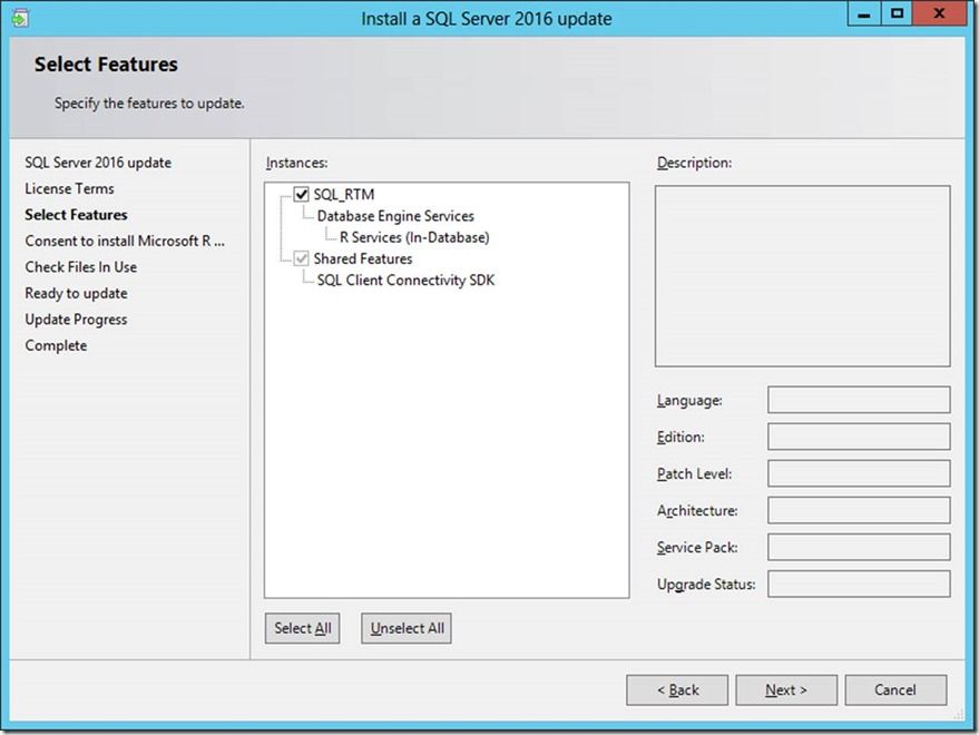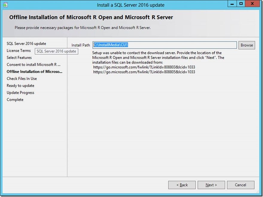 Now that you have a RTM instance installed above, let’s patch it with Cumulative Update 1. CU1 also has a different version of the R components, so the process described above (downloading the correct CAB files and moving them to the ‘offline’ computer) is still applicable. Let’s see how this goes – first, let’s launch CU1 setup as below: