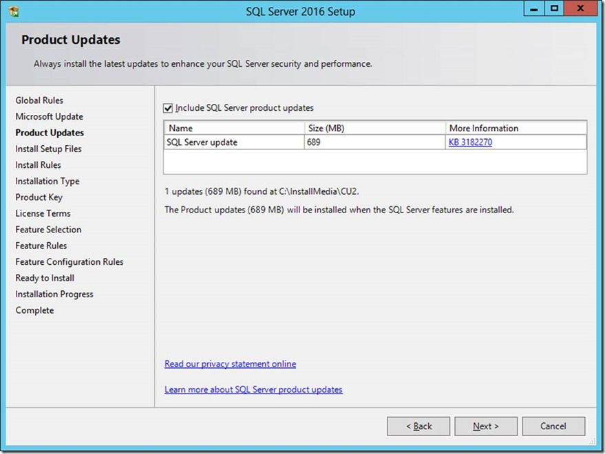 The rest of the steps are just as per any other normal installation. At this stage, you will get an instance of SQL Server which is already at CU2 patch level!