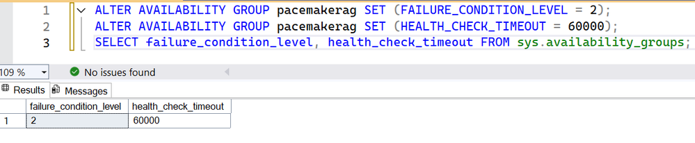 ALTER AVAILABILITY GROUP pacemakerag SET (FAILURE_CONDITION_LEVEL = 2);-- Setting health check timeout