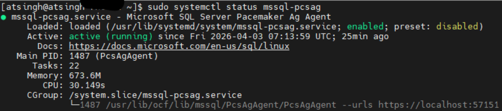 Pacemaker HA agent v2 uses a service‑based architecture. The agent runs as a dedicated system service named mssql-pcsag, which is responsible for handling SQL Server–specific high availability operations and communication with Pacemaker.