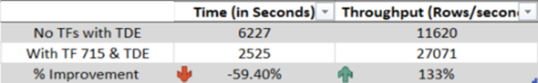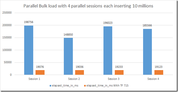 TF 715 significantly enhances the performance of parallel bulk load operation on a heap with no non-clustered index. The following chart compares the data load performance improvement of 4 parallel bulk load session inserting 10 millions records each on a sample heap table with no indexes. The total elapsed time with TF 715 is around 1/10 the time taken by bulk insert without TABLOCK.