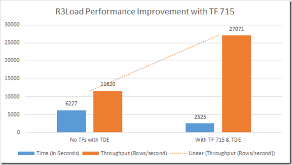 Following graph shows the comparison of data migration throughput and elapsed time improvement with TF 715 in SQL Server 2014 SP1 CU8 for the same amount of data loaded by R3Load process.