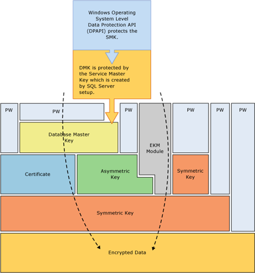 SQL Server encrypts data with hierarchical encryption and key management infrastructure. Each layer encrypts the layer below it by using a combination of certificates, asymmetric keys, and symmetric keys. Asymmetric keys and symmetric keys can be stored outside of SQL Server in an Extensible Key Management (EKM) module. The following illustration shows that each layer of the encryption hierarchy encrypts the layer beneath it, and displays the most common encryption configurations.