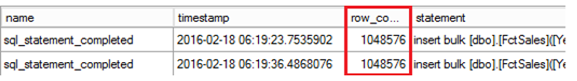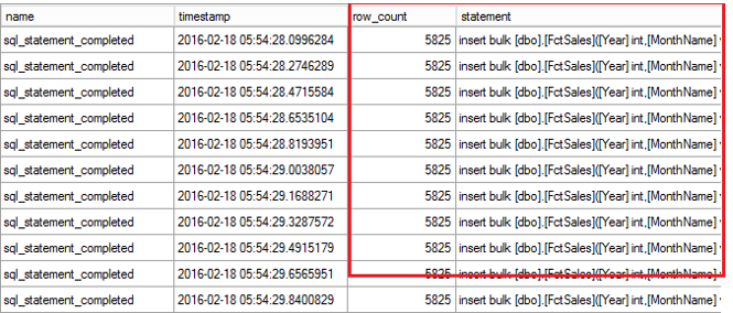 An extended event capture below shows us that each bulk insert ended up with a batch size of 5825 rows.