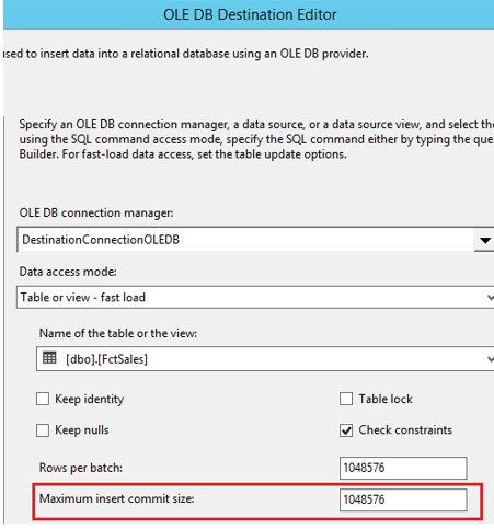 Given the rowgroup max size of 1,048,576 if you try to force your Maximum insert commit size as shown below, you could end up getting very few rows committed per insert and more importantly they can all end up in the delta store which is a rowstore. How many rows are inserted in one transaction totally depends on the row size as to how many rows would fit in a 10MB buffer. Prior to SQL Server 2016, you could only adjust the DefaultBufferSize to a maximum of 100MB. For additional details see the article: SSIS Buffer Sizing