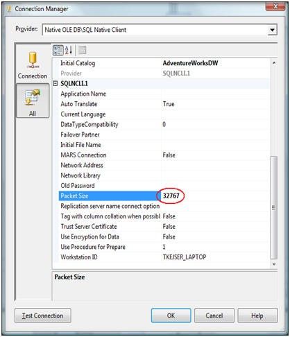 Since Integration Services is all about moving large amounts of data, you want to minimize the network overhead. This means that the value 32K (32767) is the fastest option. While it is possible to configure the network packet size on a server level using sp_configure, you should not do this. The database administrator may have reasons to use a different server setting than 32K. Instead, override the server settings in the connection manager as illustrated below.