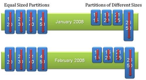 For ETL designs, you will want to partition your source data into smaller chunks of equal size. This latter point is important because if you have chunks of different sizes, you will end up waiting for one process to complete its task. For example, looking at the graph below, you will notice that for the four processes executed on partitions of equal size, the four processes will finish processing January 2008 at the same time and then together continue to process February 2008. But for the partitions of different sizes, the first three processes will finish processing but wait for the fourth process, which is taking a much longer time. The total run time will be dominated by the largest chunk.