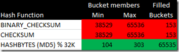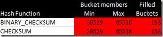 This does not look promising, we would expect the min/max to linger around 152 and the number of filled buckets to be 64K. Books Online does state :