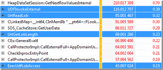 UDFInvokeExternal sounds like the call that wraps my CLR. But wait a minute. What are those UrtReadLob , UrtGetLobLength and ExecUdfLobAccess in there? They add up to more than the time taken for the highest CPU consumer ( GetNextRowValuesInternal ).