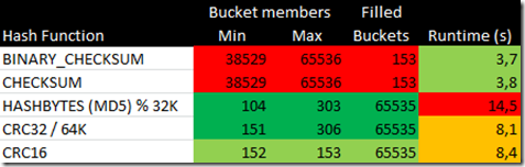 Runtime with the new data type: 7 seconds. A factor 8 improvement! This is also faster than the HASHBYTES run. If I could come up with a hash function that has a good spread, but which is cheaper than MD5…