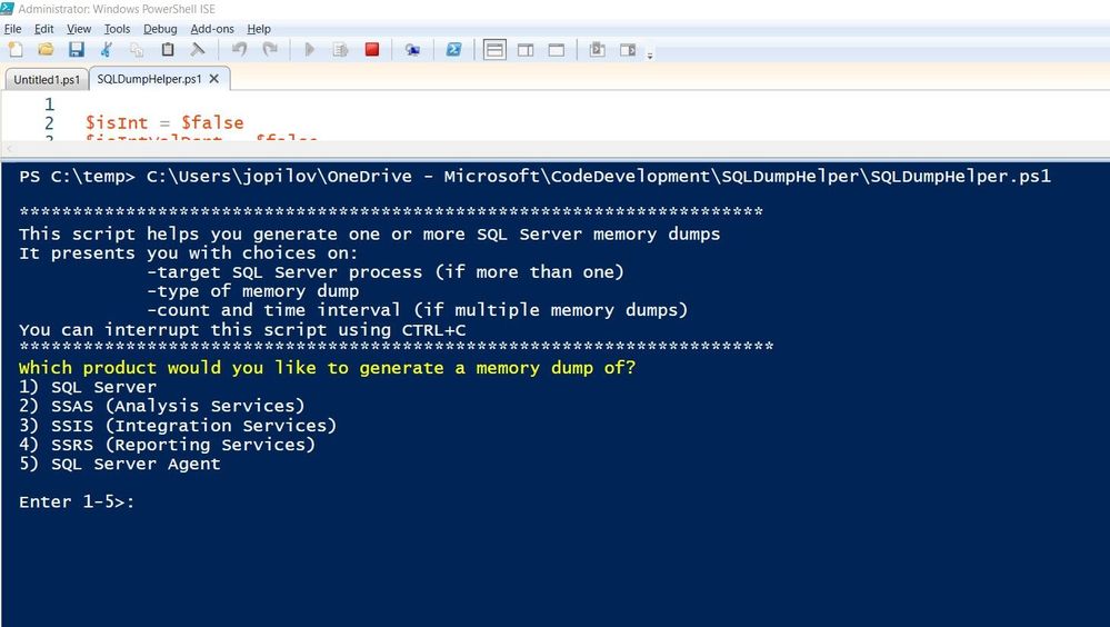 Recently, we published a PowerShell script to create memory dumps of SQL Server, SSAS, SSRS, and SSIS - called it SQLDumpHelper.ps1 . The PS script uses SQLDumper.exe and it makes it very easy to generate the dumps by avoiding having to look up SQLDumper.exe command switches.