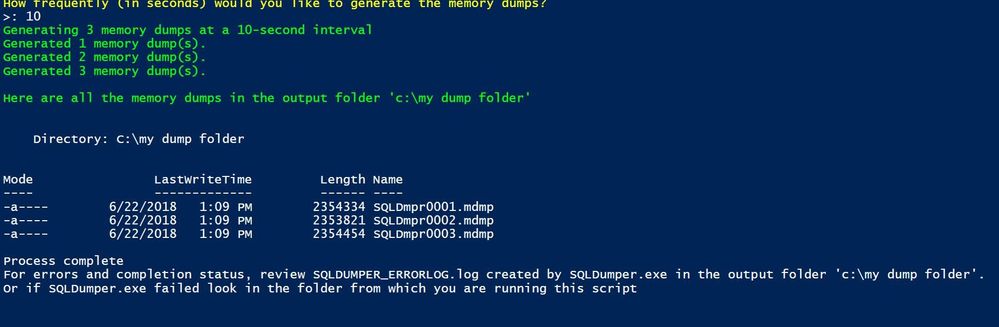 Below is an example of how to generate multiple SQL Server memory dumps.