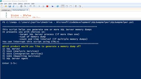 First published on MSDN on Jun 30, 2018 Recently, we published a PowerShell script to create memory dumps of SQL Server, SSAS, SSRS, and SSIS - called it SQLDumpHelper.ps1 . The PS script uses ...