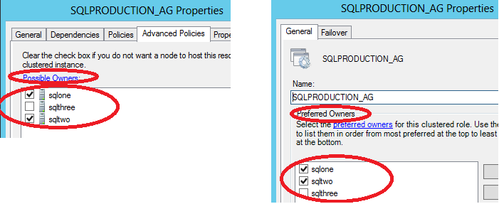 In conclusion, there are clustered resources for which you can configure possible / preferred owners to control. For availability groups, SQL server dynamically configures these values, and they should not be modified. Manual modification can result in unexpected behavior of resource/group.