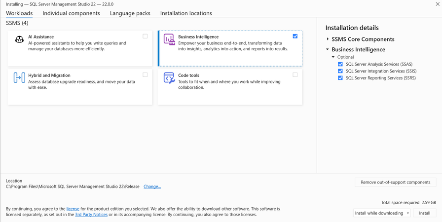 You can install SQL Server Integration Services by selecting Modify in the Visual Studio Installer, adding the Business Intelligence workload, or from the Individual components tab if you only want SSIS. If you are updating a previously installed version of SSMS 22, after the update has finished installing you will need to go back to the Visual Studio Installer and add the SSIS component from the Modify workflow. For further details, refer to Install SQL Server Management Studio.