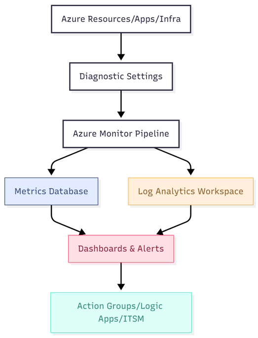 4. Action & Automation | Responding through alerts, workflows, or ITSM integrations. | Alerts + Action Groups → Teams, Logic Apps, PagerDuty. |