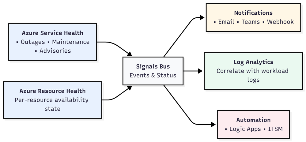 Azure provides Service Health and Resource Health to help differentiate between Azure-side issues and workload issues. They complement Azure Monitor by tracking platform events and maintenance notifications.